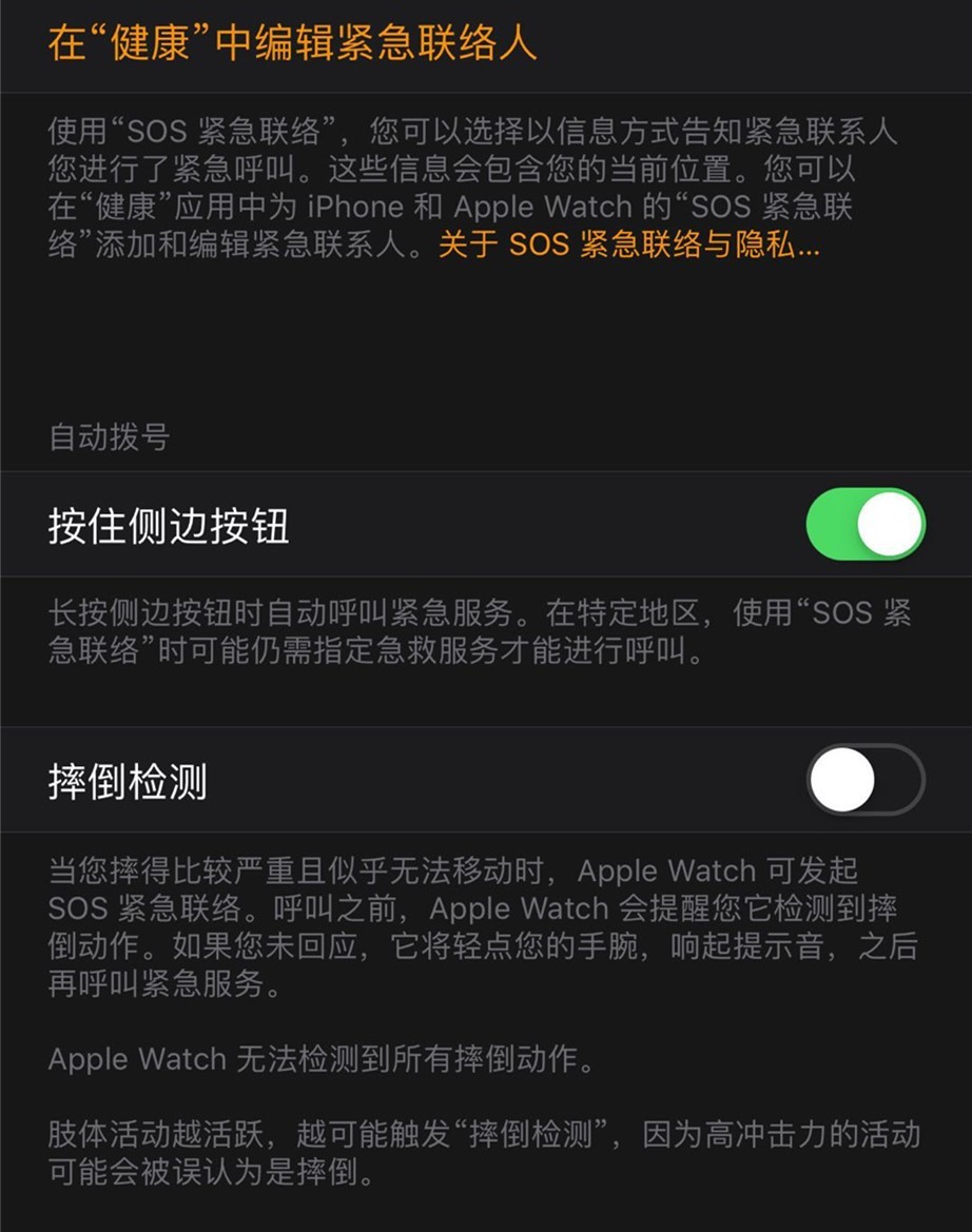 假如它分辨你摔倒了,便会传出提示,向你开展了解,假如提示后一分钟内你没开展答复实际操作得话,它又沒有发觉给你站起的主题活动征兆,便会全自动拨通SOS电話,并让你预置在“身心健康”运用的“诊疗急救卡”中的应急联系人发送短信和位置信息。