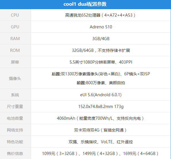 配置方面,cool1 dual搭载高通652处理器,有三种内存组合版本,前置800万像+后置双1300万像素的摄像组合,内置4060mAh电池,支持指纹识别、全网通和红外遥控,在千元机价位上,这样的配置使其性价比极高。